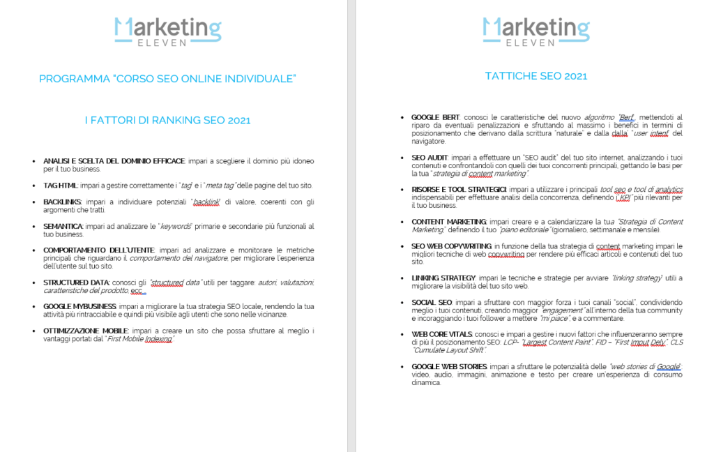 ELEVEN MARKETING FORMAZIONE organizza Corsi SEO Online individuali per studenti, professionisti e aziende che vogliono essere aggiornati sulle tendenze di posizionamento SEO 2021, migliorando la visibilità dei propri siti internet.