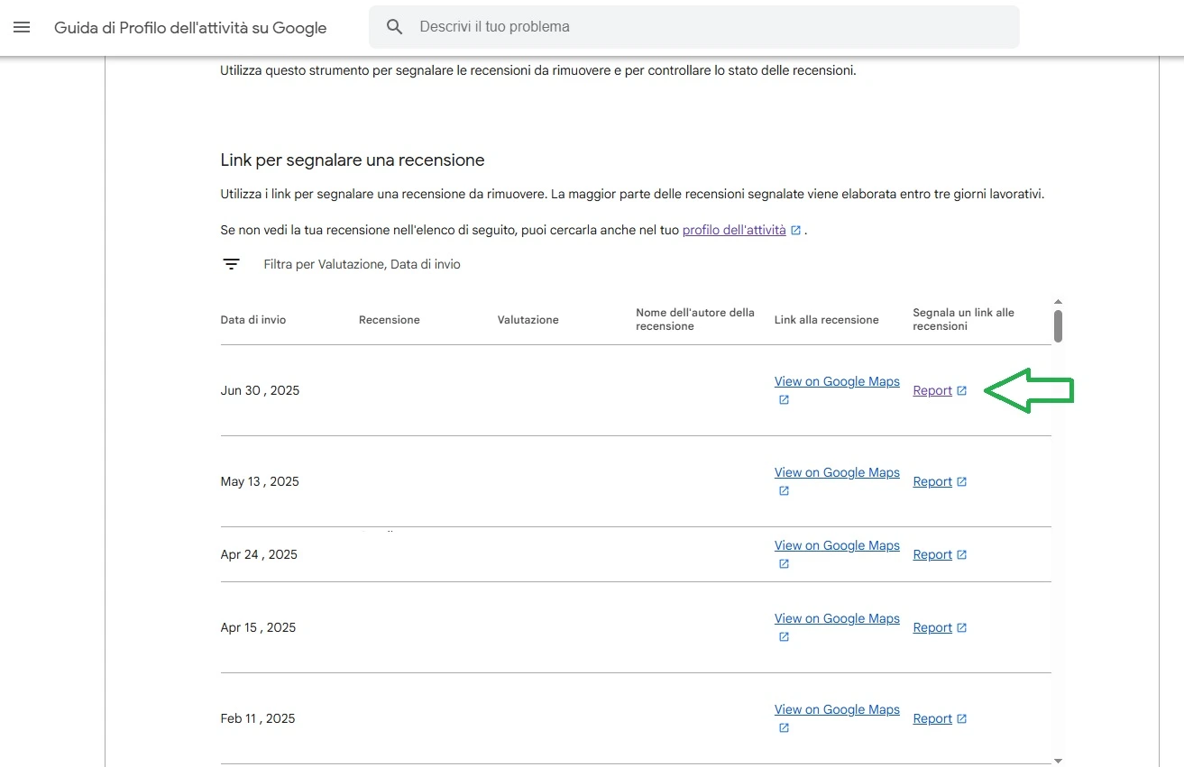 • Vai su questo link: Segnalare recensioni inappropriate sul profilo dell’attività