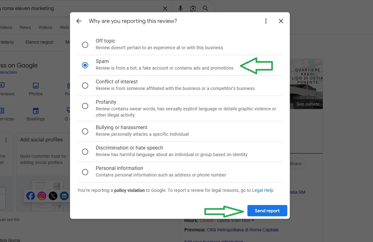 • Scegli il contenuto di recensione che va contro le norme di Google (Esempi: “Spam” o “Linguaggio volgare”).
